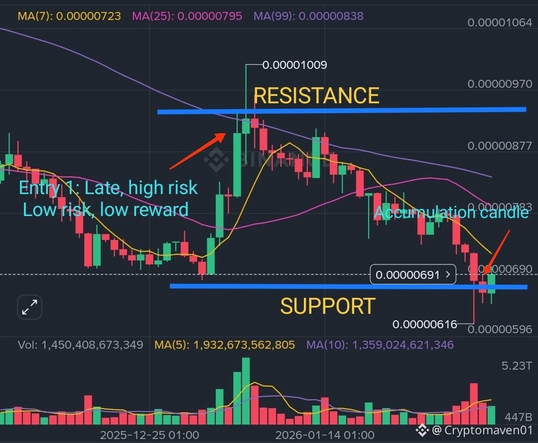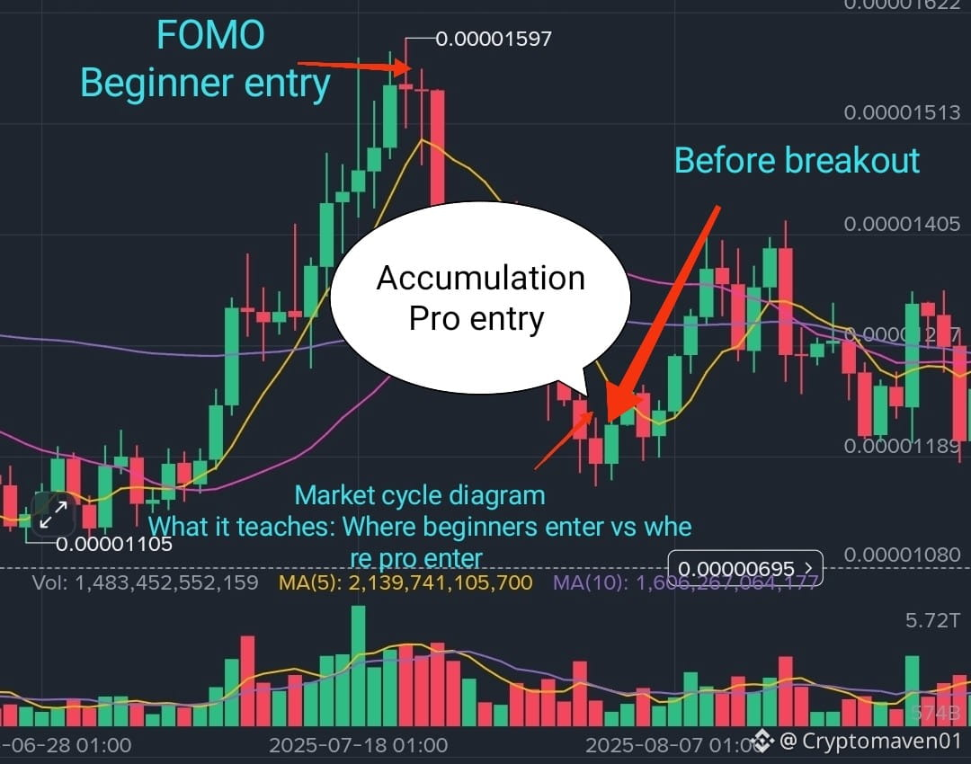 Beginners only notice the expansion phase because it is loud and fast. But the best entries are usually during quiet accumulation, when price is boring and nobody is talking about the asset.