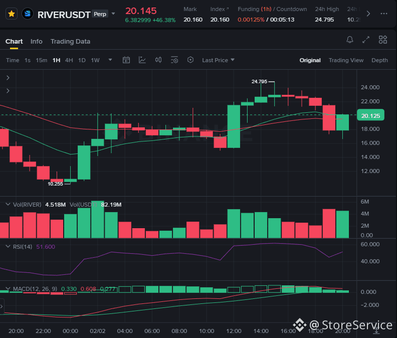 RIVER: A massive PUMP! Up +26% today, hitting a high of $24.79 before retracing to ~$19.80. High volatility here means high profit, but high danger of getting "rekt" on the retrace.