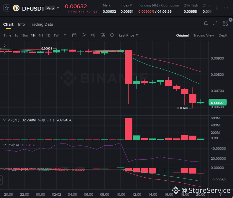 DF (dForce): This is ABSOLUTE CARNAGE. Down -32% today with an RSI of 15. It's a bloodbath. DO NOT LONG yet, wait for a confirmed bottom.