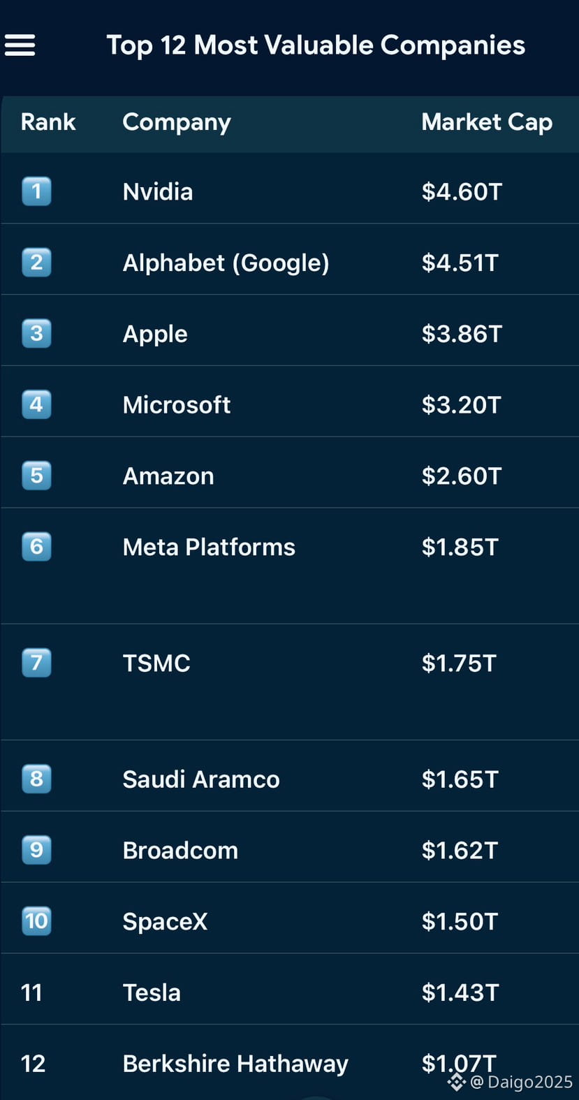 ⢠The Trillion-Dollar Floor: Every single company in the Top 12 is now valued at over $1 trillion, highlighting a massive concentration of wealth in the tech and energy sectors.