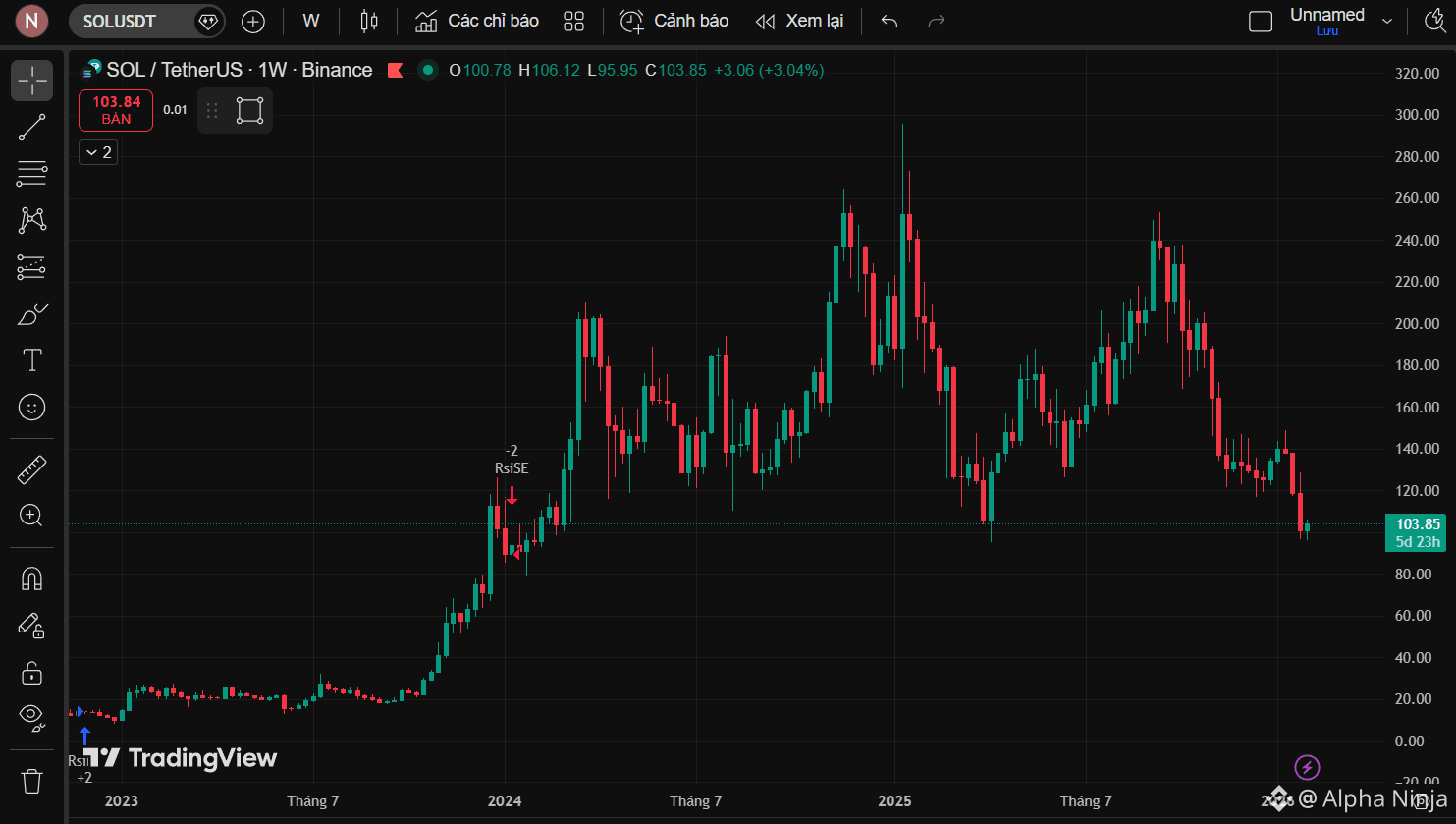 Trên weekly, SOL đã hoàn thành một chu kỳ tăng lớn 2023–2024 → phân phối → điều chỉnh sâu.