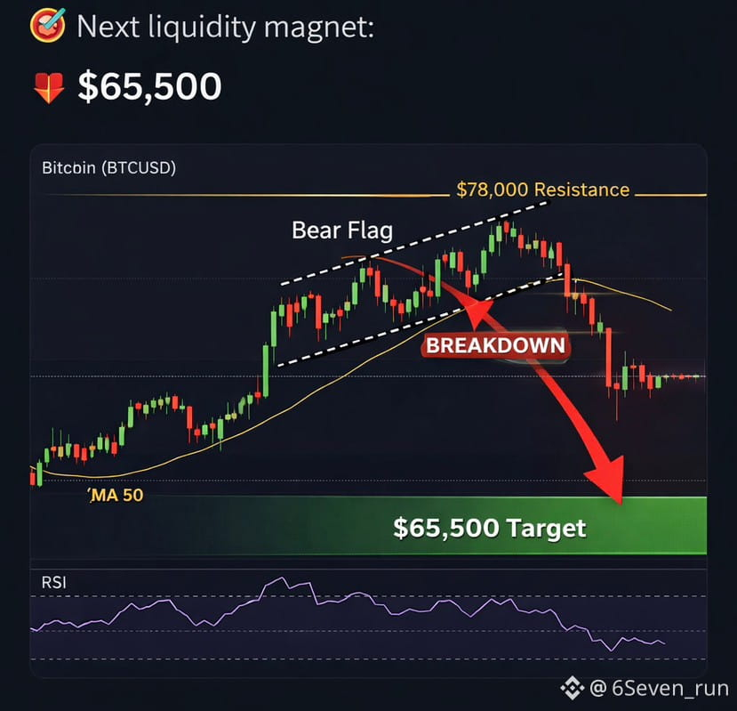 📊 When key supports fail, price naturally searches for the next major liquidity zone. Based on technical levels and historical reactions, the next strong magnet lies around $65,500.🎯