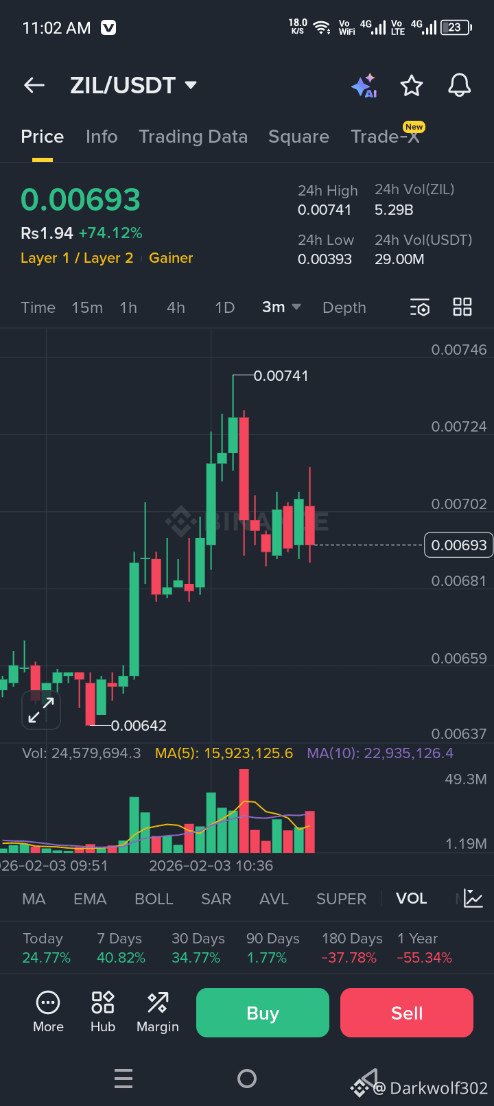 $ZIL (Zilliqa) has surged over **+70% in 24 hours**, currently trading near **0.0069 USDT**, showing strong bullish momentum and renewed market interest.