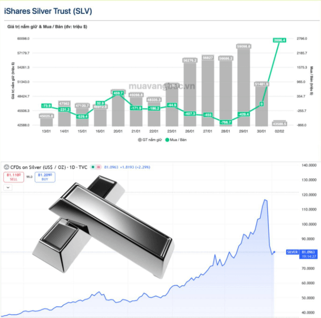 În data de 2/2, iShares Silver Trust (SLV) – cel mai mare fond de argint din lume – a investit aproape 3 miliarde USD pe piață doar într-o singură zi, echivalentul a aproximativ 500 de tone de argint.
