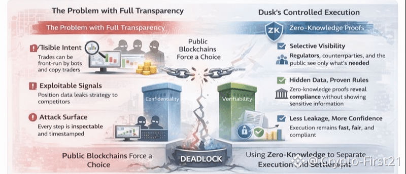 In real finance, information is power. A fund manager broadcasting positions in real time hands strategy to competitors. A trading desk exposing execution intent before settlement invites front running, copy trading, and adverse selection. Even when rules are followed perfectly, information leakage turns rational behavior into a disadvantage. The result is not accountability, but distorted execution.