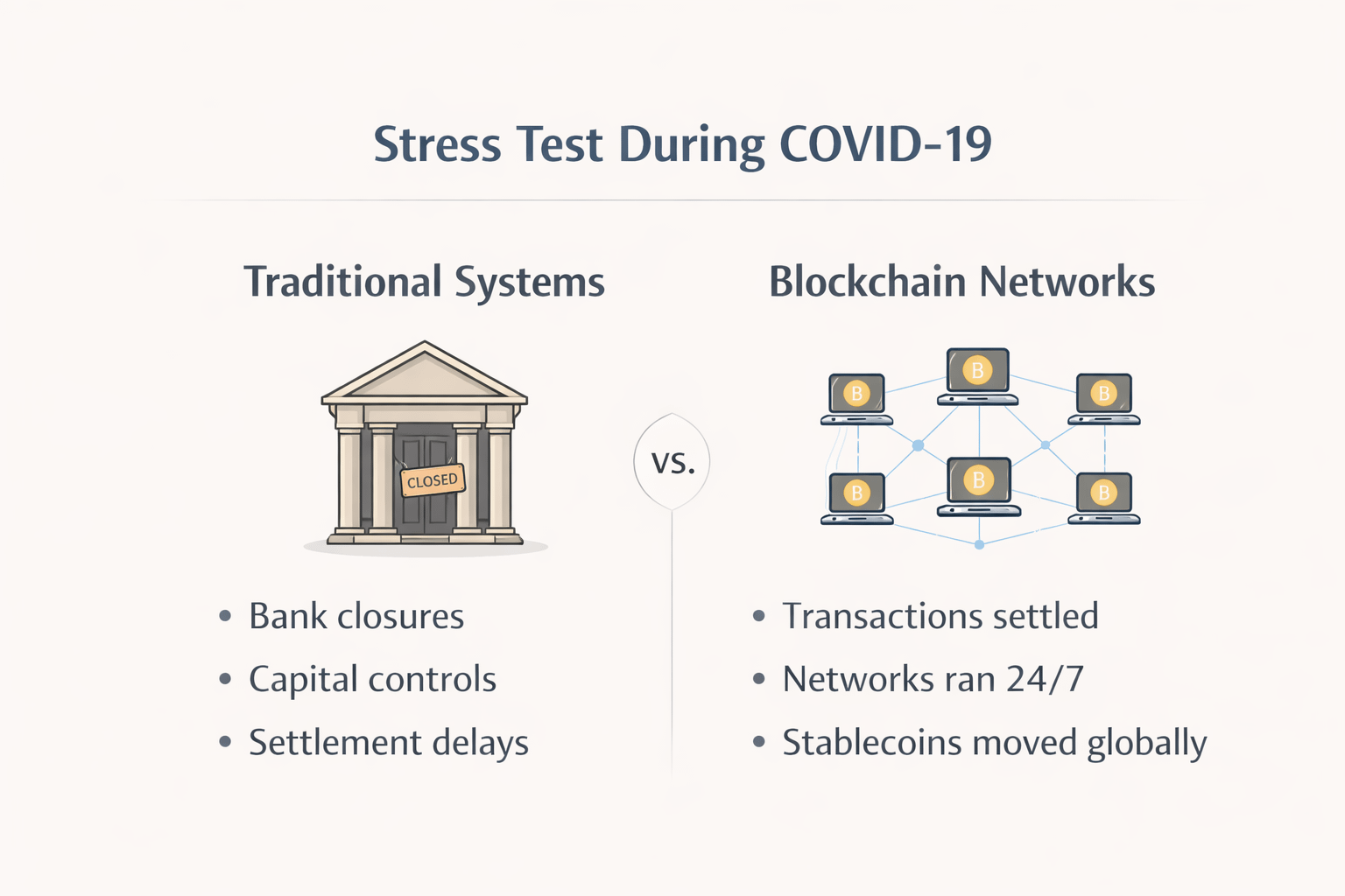 During this period, crypto adoption accelerated. Not because crypto solved the crisis, but because it continued operating while parts of the traditional system slowed or restricted access. Blockchains did not pause. Transactions settled. Smart contracts executed. Stablecoins moved value globally without intermediaries.