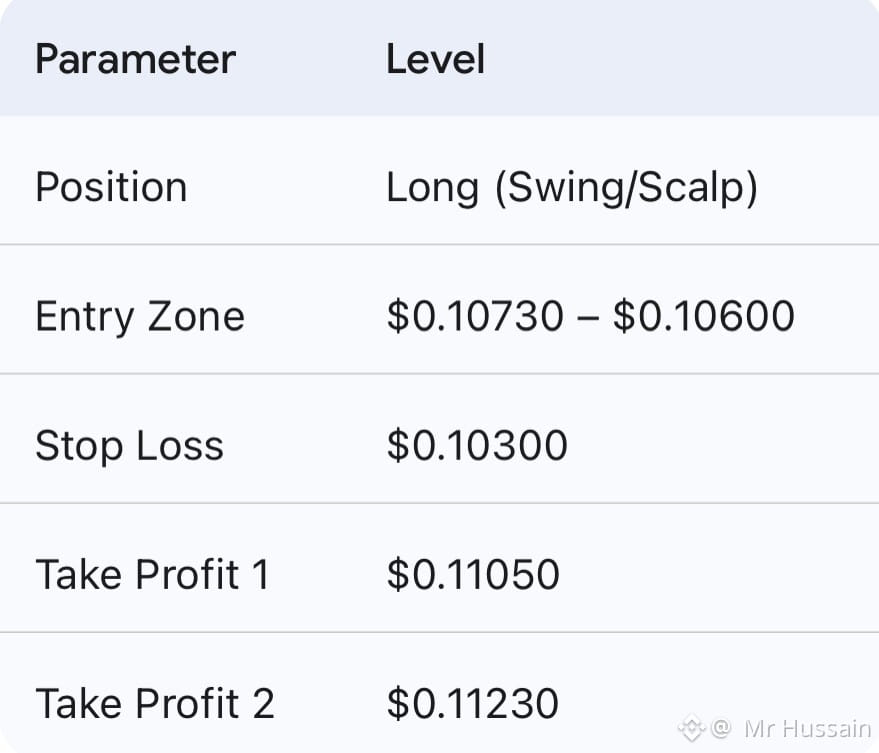 Basically, the sell pressure is getting soaked up, and the momentum feels heavy in the best way possible. As long as the $0.10500 base stays firm, the bulls are in the driver's seat. I’m looking for a clean candle close above the current resistance wick to really send this.