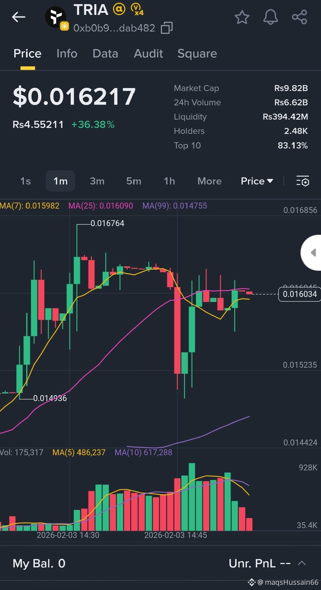 $SOMI (TRIA) is pumping due to a clear combination of volume expansion, bullish market structure, and a technical breakout. Price successfully broke above the prior consolidation range near 0.0150–0.0155, supported by a strong increase in buying volume, confirming genuine demand rather than a low-liquidity spike. The move above short-term and mid-term moving averages signaled a momentum shift, while the MA(99) acted as a solid dynamic support base. A brief sharp pullback toward 0.0152 appears to be a liquidity sweep, flushing weak positions before price quickly reclaimed higher levels—often a sign of smart money participation ahead of continuation.