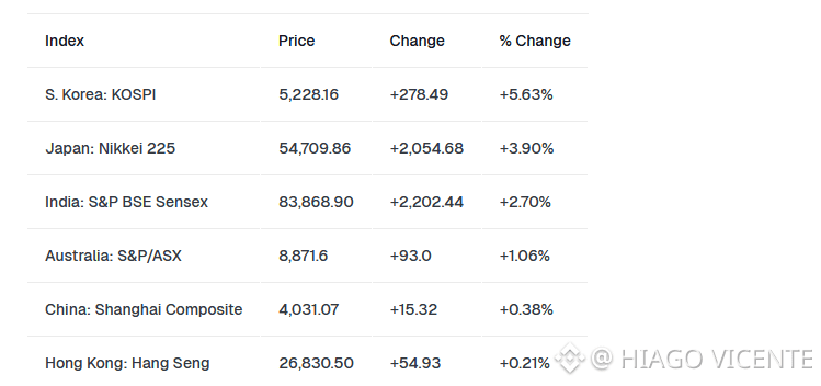 O índice MSCI Ásia-Pacífico subiu 2,2%, recuperando a maior parte das perdas de segunda-feira. O KOSPI da Coreia do Sul liderou a região com uma alta de mais de 5,63%, seguido pelo Nikkei 225 do Japão, com 3,90%, e pelo Sensex da Índia, com 2,70%.