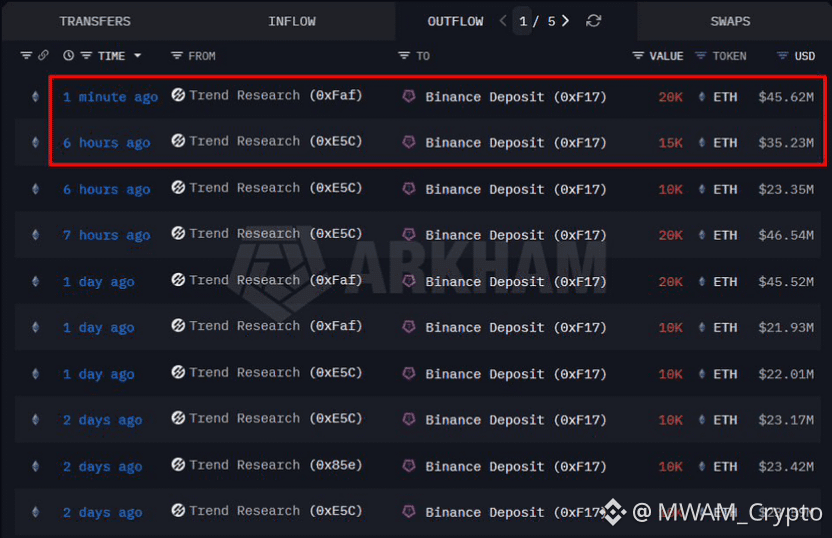 Trend Research has transferred another 35,000 $ETH (worth approximately $80.85M) to Binance, extending its aggressive pattern of exchange deposits.