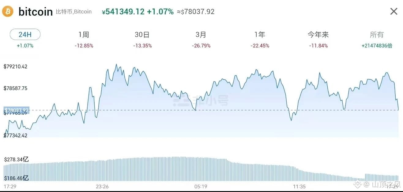 技术图表显示,比特币日线级别形成“断头铡刀”式的破位形态,接连失守78000、77000、76000及75000美元数道支撑,成交量较前一日放大52%,呈现典型的“放量下跌且缺乏买盘承接”特征。