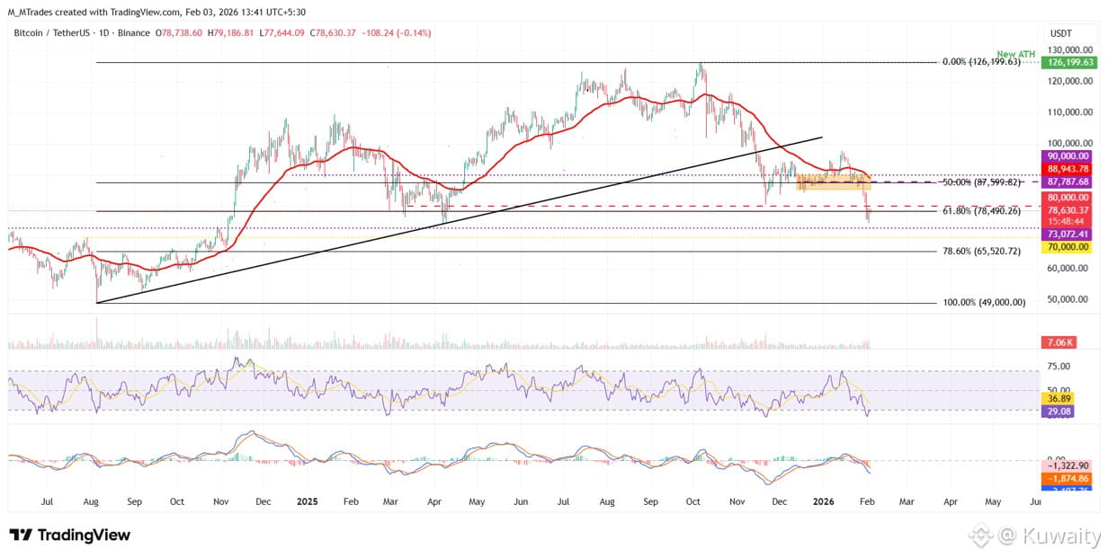 على الرسم البياني اليومي، أغلق $BTC دون مستوى تصحيح فيبوناتشي 61.8% (من أدنى مستوى في أغسطس 2024 عند 49000 دولار إلى أعلى مستوى تاريخي في أكتوبر 2025 عند 126199 دولار) عند 78490 دولار يوم الأحد، ويواجه مقاومة حول هذا المستوى يوم الثلاثاء.