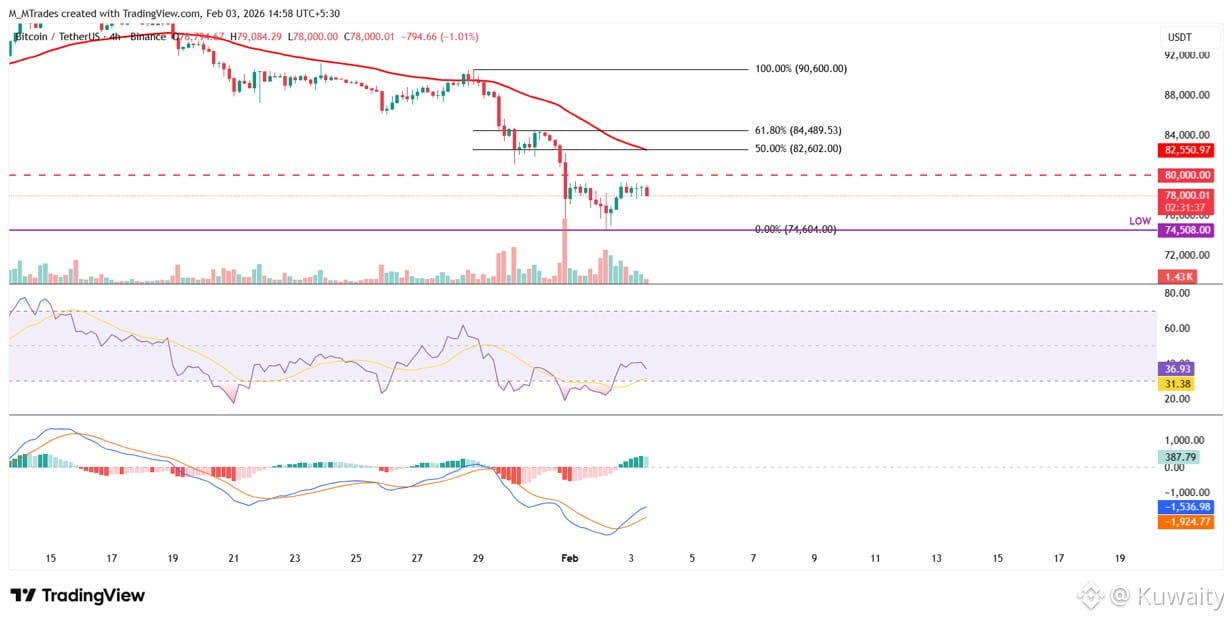 استقر سعر البيتكوين ($BTC ) عند 78000 دولار في وقت كتابة هذا التقرير يوم الثلاثاء بعد أن تعافى بنسبة %2.30 في اليوم السابق، عقب التصحيح الكبير الذي حدث الأسبوع الماضي. قدم الطلب المؤسسي دعمًا قصير الأجل لملك العملات المشفرة حيث سجلت صناديق الاستثمار المتداولة (ETFs) تدفقات جديدة يوم الاثنين بالتزامن مع تراكم استراتيجية (MSTR). يجب على المتداولين توخي الحذر، حيث على الرغم من التعافي على المدى القصير، لا يزال الاتجاه طويل الأجل للبيتكوين هبوطيًا.