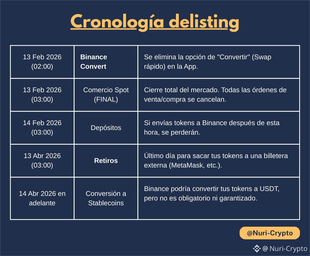 14 de febrero de 2026 (03:00 UTC): Los depósitos de estos tokens ya no serán acreditados en las cuentas de Binance.