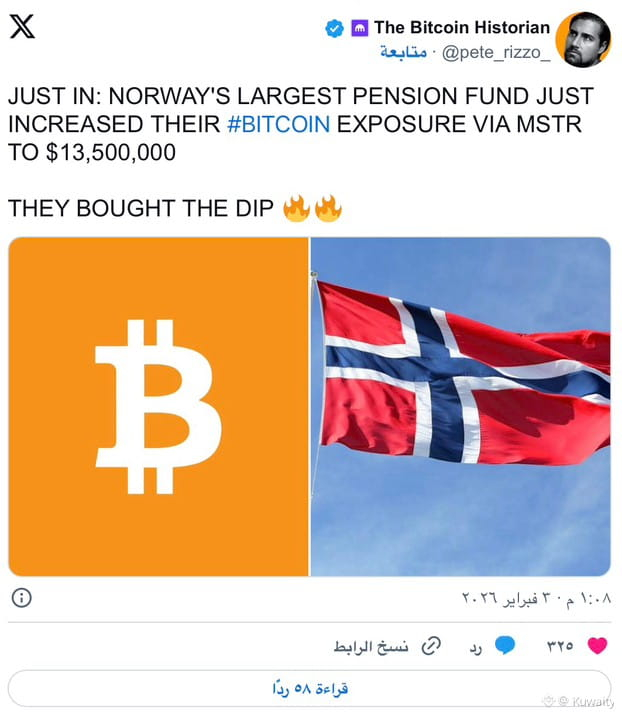قام أكبر صندوق معاشات في النرويج بخطوة حاسمة تجذب الاهتمام العالمي. زاد الصندوق تعرضه لعملة $BTC من خلال استثمار نحو 13.5 مليون دولار عبر شراء أسهم شركة MicroStrategy. جاء هذا القرار خلال مرحلة تقلبات عالية في السوق، عندما تردد العديد من المستثمرين. وبدلاً من التراجع، اختار الصندوق التحرك بثقة. وتسلط هذه الخطوة الضوء على تزايد القناعة المؤسسية بالبيتكوين كأصل طويل الأجل.
