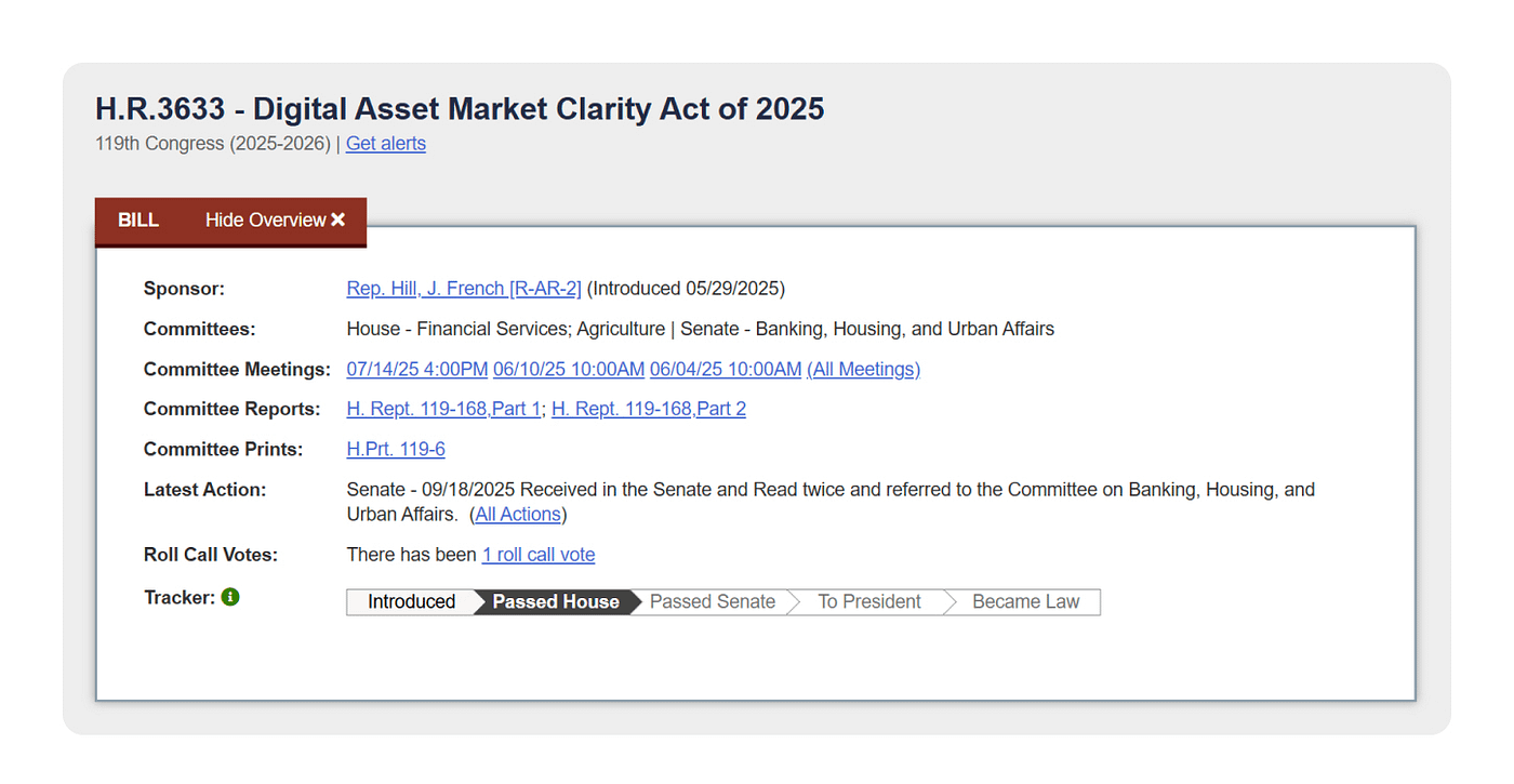 Camera Reprezentanților din SUA a adoptat Legea CLARITY (H.R. 3633) în iulie 2025 cu sprijin bipartizan. Începând cu ianuarie 2026, factura așteaptă acțiuni în Senatul SUA, unde a fost referită la Comitetul Senatului pentru Bănci, Locuințe și Afaceri Urbane. Procesul legislativ implică, de asemenea, contribuții din partea Comitetului Senatului pentru Agricultură, Nutriție și Pădurile cu privire la aspectele legate de supravegherea CFTC.