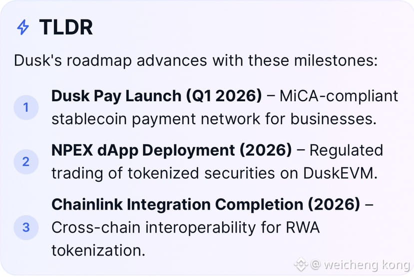 在具体进展上,Dusk 与荷兰受监管证券平台 NPEX 的合作,被视为其 RWA 方向的重要探索案例。尽管具体资产规模仍需等待权威披露确认,但这一合作本身已经标志着 Dusk 正从概念验证,走向受监管市场的真实测试。同时,围绕 MiCA 合规支付与结算的 Dusk Pay 规划,也显示出其并非只停留在资产代币化层面,而是在尝试构建完整的机构级金融轨道。