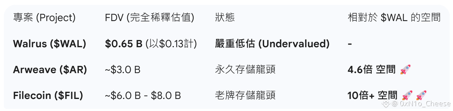 為了證明 $0.13 是被嚴重低估的,我們將 Walrus 與同賽道的龍頭做個對比: