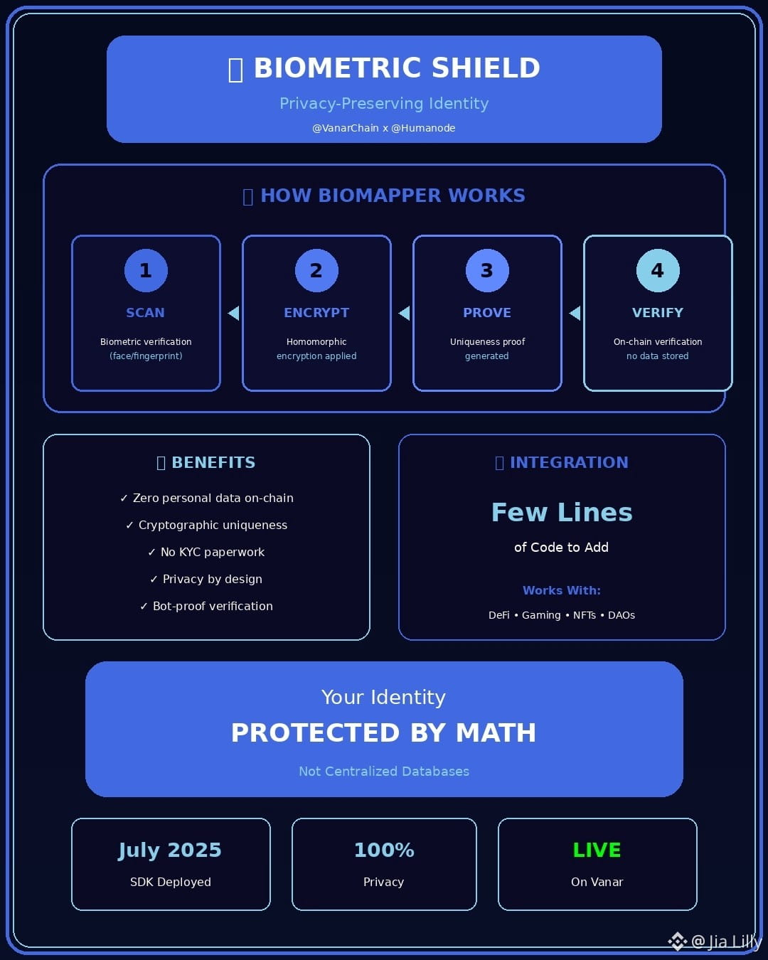 Developers can easily protect their applications with this system. People who build things on Vanar can add a security feature called biometric Sybil resistance to their smart contracts with just a few lines of code. This means that whether you are making a marketplace that uses intelligence, a PayFi system, a platform, for tokenized assets a DeFi protocol or a gaming economy Biomapper checks that every person using it is really a human being before they can do anything. You do not need to fill out a lot of Know Your Customer paperwork. Biomapper does not violate your privacy by sharing your information with big databases. Biomapper makes sure that every participant is genuinely a being before they can interact with Vanar and Biomapper and all the things that people build on Vanar. I want a mathematical proof that shows something is one of a kind. This proof of uniqueness has to be real. It must be impossible to fake or duplicate the mathematical proof of uniqueness. The mathematical proof of uniqueness is what I am looking for.