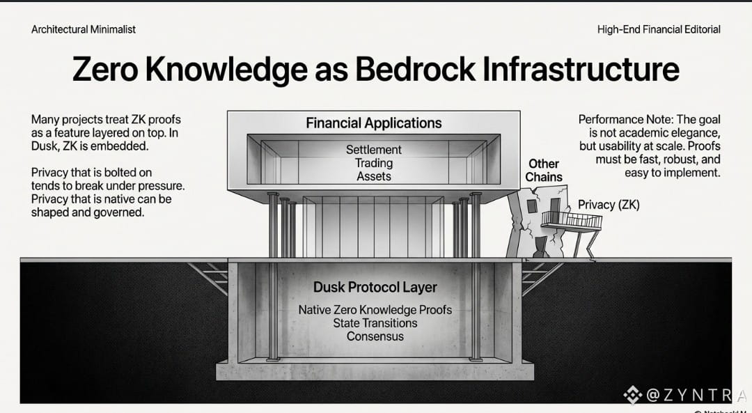 In Dusk, zero knowledge is not a feature layered on top. It is embedded into how transactions, contracts, and state transitions are handled. This matters because privacy that is bolted on tends to break under regulatory pressure. Privacy that is native can be shaped and governed.