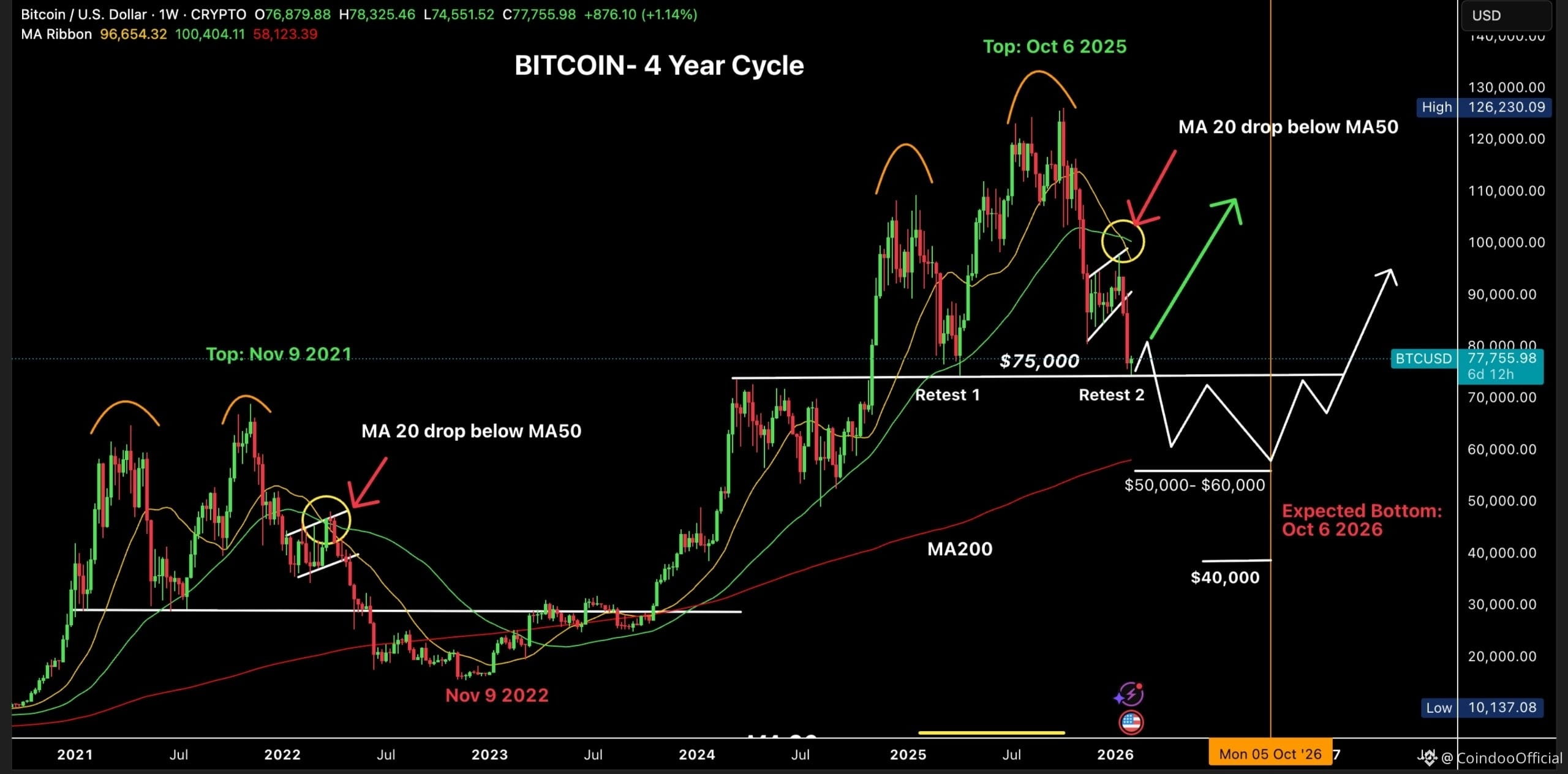 The market’s focus is now on two questions. First, can Bitcoin hold above $75,000 on weekly closes? Second, does the April 2025 low remain intact? As long as both conditions are met, the higher-probability path remains scenario one, where the market builds a base and prepares for another leg higher. If either level fails, scenario two quickly becomes dominant.