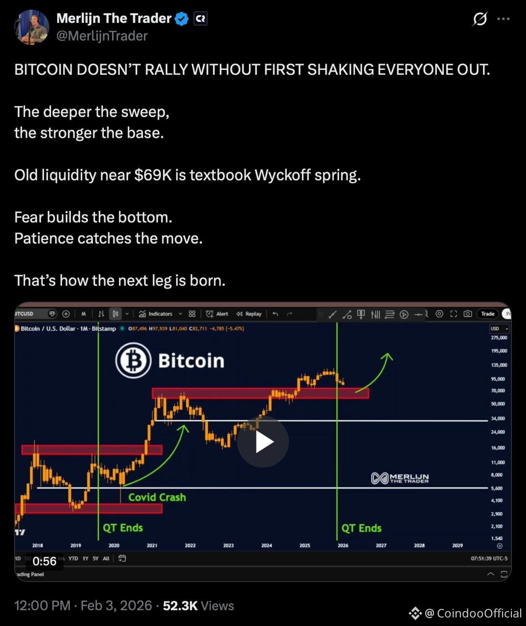 Merlijin’s chart highlights a recurring cycle behavior: deep sell-offs that flush liquidity and force capitulation before the next major leg begins. He points to old liquidity clustered between roughly $69,000 and $75,000 as a classic base-building zone, where fear peaks and stronger buyers tend to step in. At the same time, Bitcoin is trading below both the 20-week and 50-week moving averages, keeping the technical picture tense.