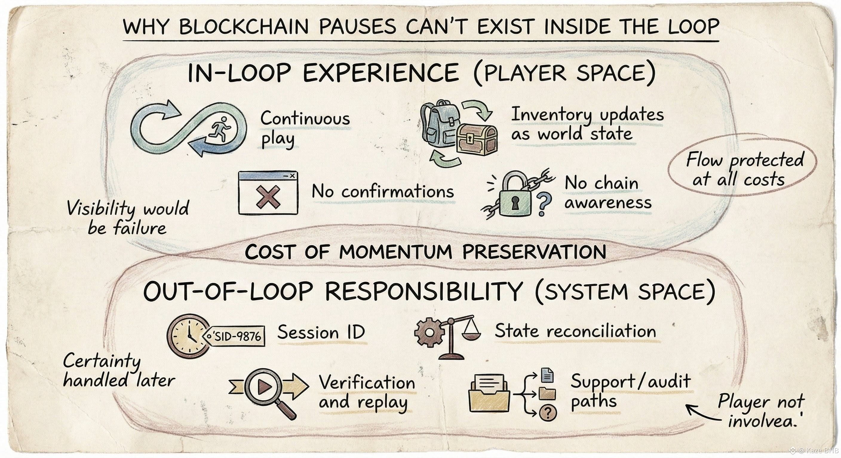 The design assumes mainstream adoption looks like repetition, not education. Sessions move forward without revalidation rituals. Game inventory behaves like part of the world, not a ledger event. Responsibility shifts away from the player and into the system. That’s how entertainment platforms survive at scale.