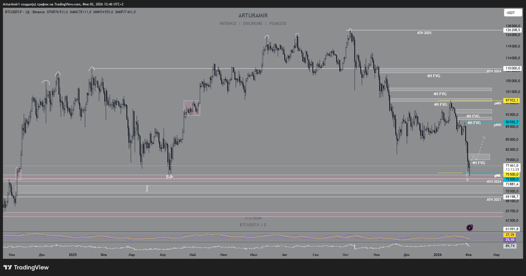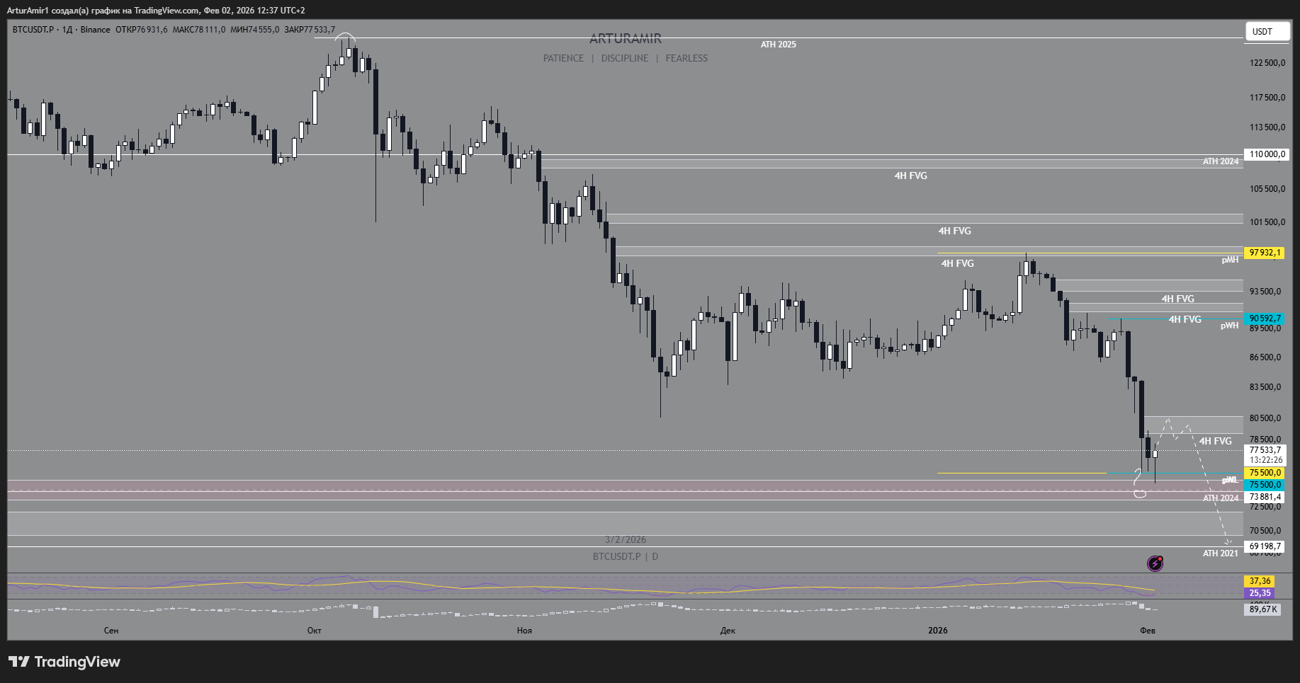 În prezent, cel mai puțin probabil, dar cel mai dorit scenariu. Închiderea gap-ului cu o mișcare ulterioară către $80 000-$82 000, consolidare și tranzacționare a nivelului.