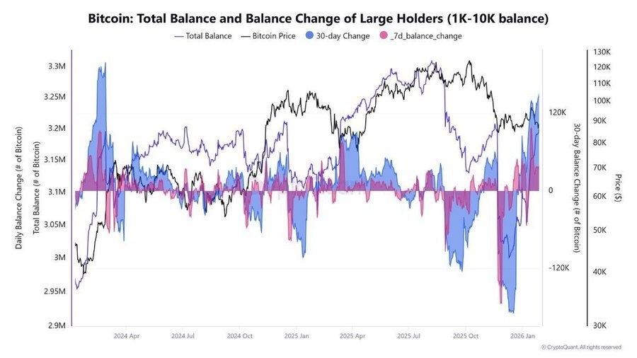Deținătorii de 1.000 – 10.000 BTC continuă să acumuleze net, în ciuda tranzacționării Bitcoin-ului aproape de 78.220 dolari.