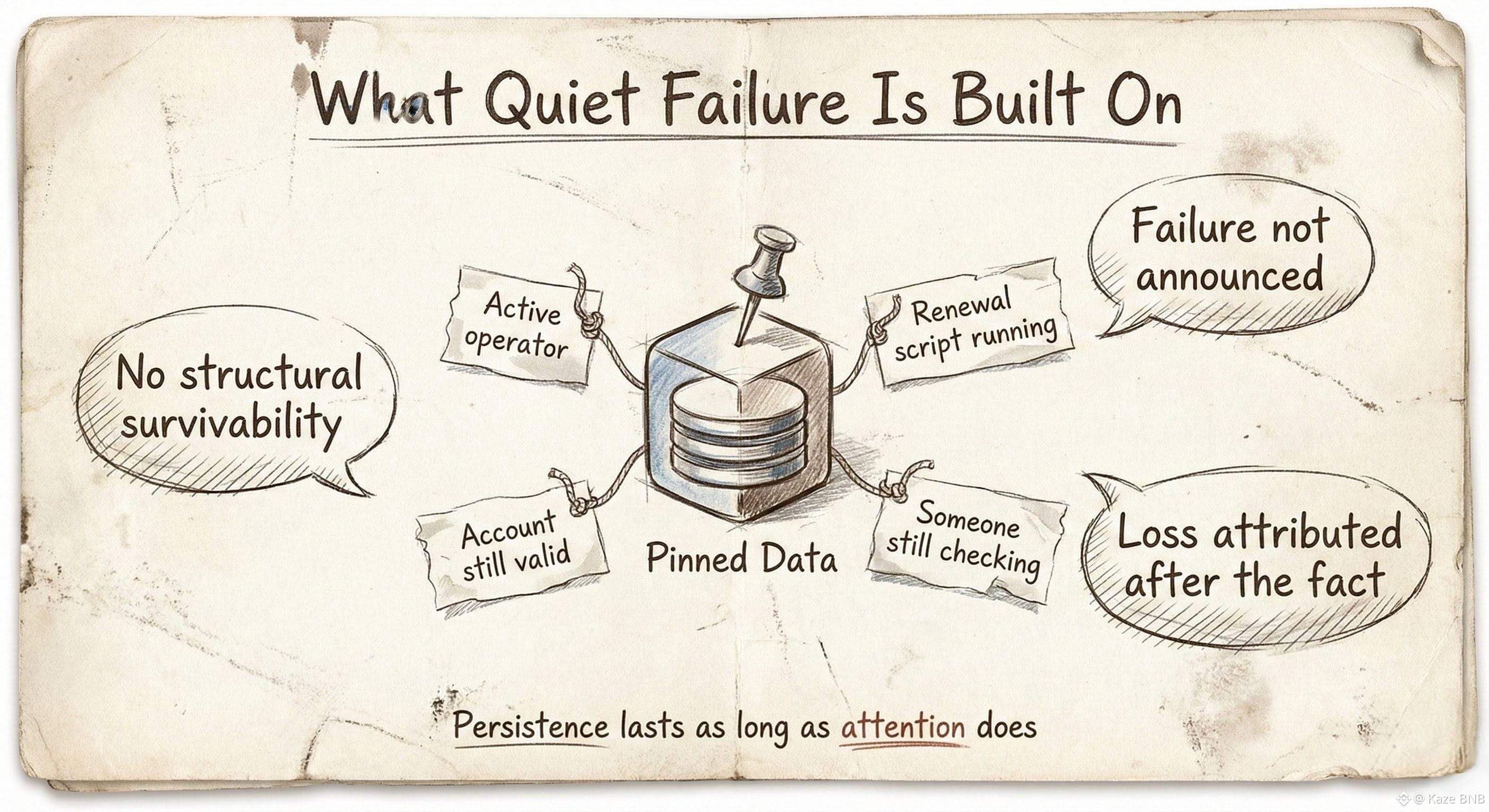 Not as an error, not as a warning, but as a realization that something everyone assumed would still be there quietly isn’t. Most storage systems are built to postpone that moment. They depend on someone staying present, renewing, pinning, checking, remembering. As long as attention holds, persistence feels real.
