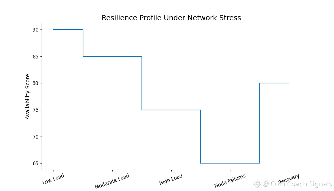 In practice, this means Walrus can tolerate a large portion of nodes going offline while still serving data. Storage overhead stays around four to five times the original size, which is far more efficient than traditional replication-heavy designs. Reads and writes remain fast, and availability is continuously checked through randomized challenges rather than constant polling.