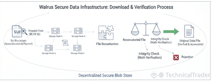 When I want my file back the process is surprisingly fast. I do not have to talk to every single node. I just ask a few of them for their slivers and once I have enough I can reconstruct the original file. The cool thing is that the math behind it makes sure that if the file I put together does not match the original fingerprint the system rejects it. This means no one can secretly swap my cat video for a virus without me knowing immediately.