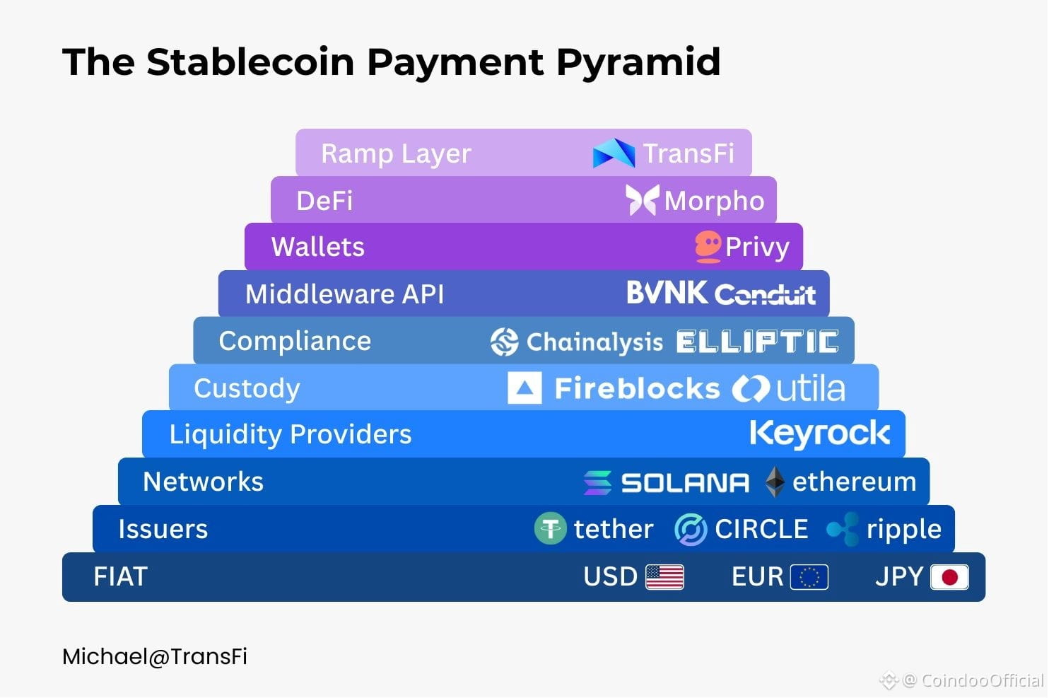 At the top of the pyramid are user-facing layers. Wallet providers like Privy focus on experience, making crypto nearly invisible to end users. DeFi protocols such as Morpho add yield and balance-sheet efficiency, while ramps connect stablecoins to local banks and everyday spending.