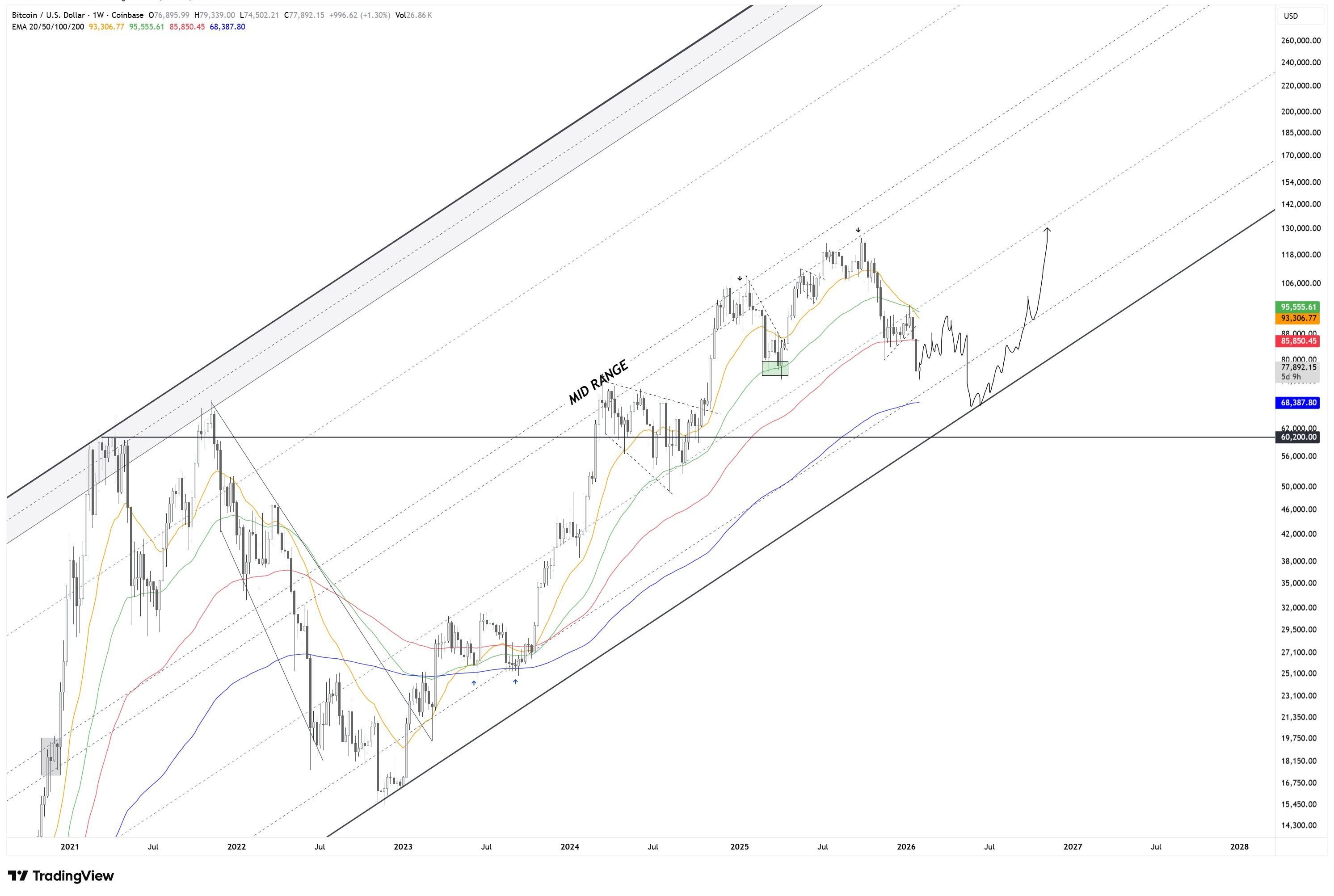 Pe baza acestei structuri, am adăugat o proiecție de înalt nivel care evidențiază unde piața ar putea căuta echilibru. Sprijinul macro actual se află în jurul regiunii de $60k, care rămâne cel mai relevant nivel structural dacă presiunea pe partea de jos continuă.
