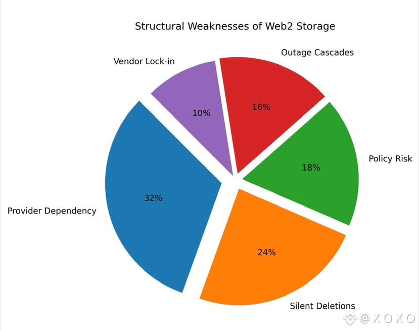 Web2 storage works so well that most people stop thinking about it. Files upload quickly. Data loads instantly. Everything feels reliable until the moment it isn’t. When something breaks in Web2 storage, it rarely fails loudly. It degrades quietly. A policy changes. A service is deprecated. An account is flagged. A region goes down. The data is still “there,” but no longer reachable in the way the application expects.