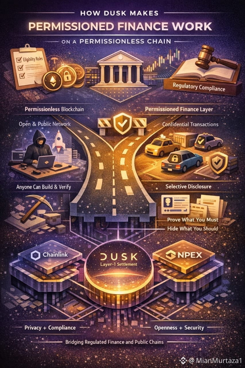 Permissioned finance sounds like a contradiction in crypto culture. The phrase feels like it comes with gatekeepers: only approved people can join, there are eligibility checks, limits on how much you can hold, reporting duties, and sometimes even the power to undo errors. A permissionless chain is meant to be the opposite—open to anyone by default.Anyone can submit a transaction. Anyone can read the ledger. Anyone can build. The reason this topic is trending now is that the world has stopped treating those two instincts as mutually exclusive.Regulators aren’t just observing anymore—they’re setting clear rules. And the market isn’t treating this like a trial run; people now expect it to work. In Europe, MiCA rolled out in steps: stablecoin rules started on June 30, 2024, and the wider rules for crypto service providers started on December 30, 2024. So this isn’t just talk anymore.Once you accept that regulated finance is not going to abandon rules, the real question becomes simpler: where do the rules live? In traditional systems, they live in institutions and contracts. The bank enforces who can open an account. The exchange enforces who can trade. The custodian decides what happens when an address is compromised. You can call it governance, but it’s also gravity: when something goes wrong, everyone needs a place to stand. Public chains have historically tried to dodge this by saying, “code is law,” as if the messiness of law, identity, and accountability was an optional feature. That posture is fading, not because builders became less idealistic, but because financial activity under stress forces the issue. In a real market, uncertainty isn’t a corner case. It’s the weather.