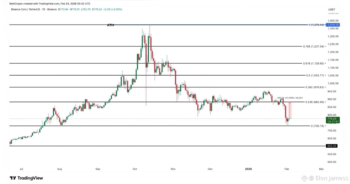 In the past few weeks, this sensitivity has been evident. $BNB has dropped about 12% over the last month and is now trading near $776, down from its October peak of around $1,370, putting it roughly 43% below its all-time high.