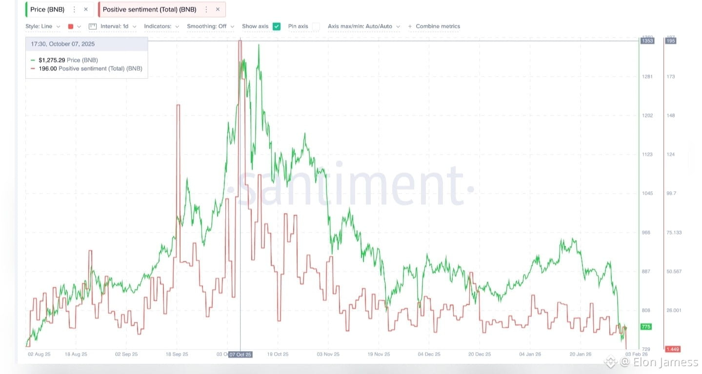The main weakness comes from sentiment. Positive social sentiment score around $BNB has fallen to around 1.44, a six-month low, down from peaks near 196 in October. Historically, local sentiment spikes have preceded bounces. This metric tracks the volume of positive social media mentions around $BNB.