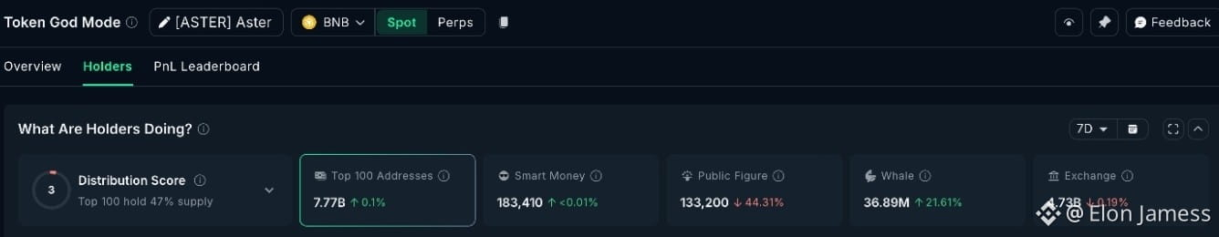 Even with renewed scrutiny of Binance following the late-January market drop, Aster has quietly drawn significant buyers. In the past week, whale holdings rose about 21.61%, while wallets tied to public figures reduced their exposure. This shows that while visible influencers pulled back during criticism, major private holders were accumulating, signaling rising confidence among large investors.