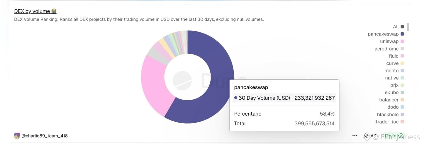 Despite recent criticism around Binance and the January market crash PancakeSwap continues to dominate decentralized trading activity. Over the past 30 days it has controlled around 58.4% of total DEX volume far ahead of Uniswap’s roughly 24%.