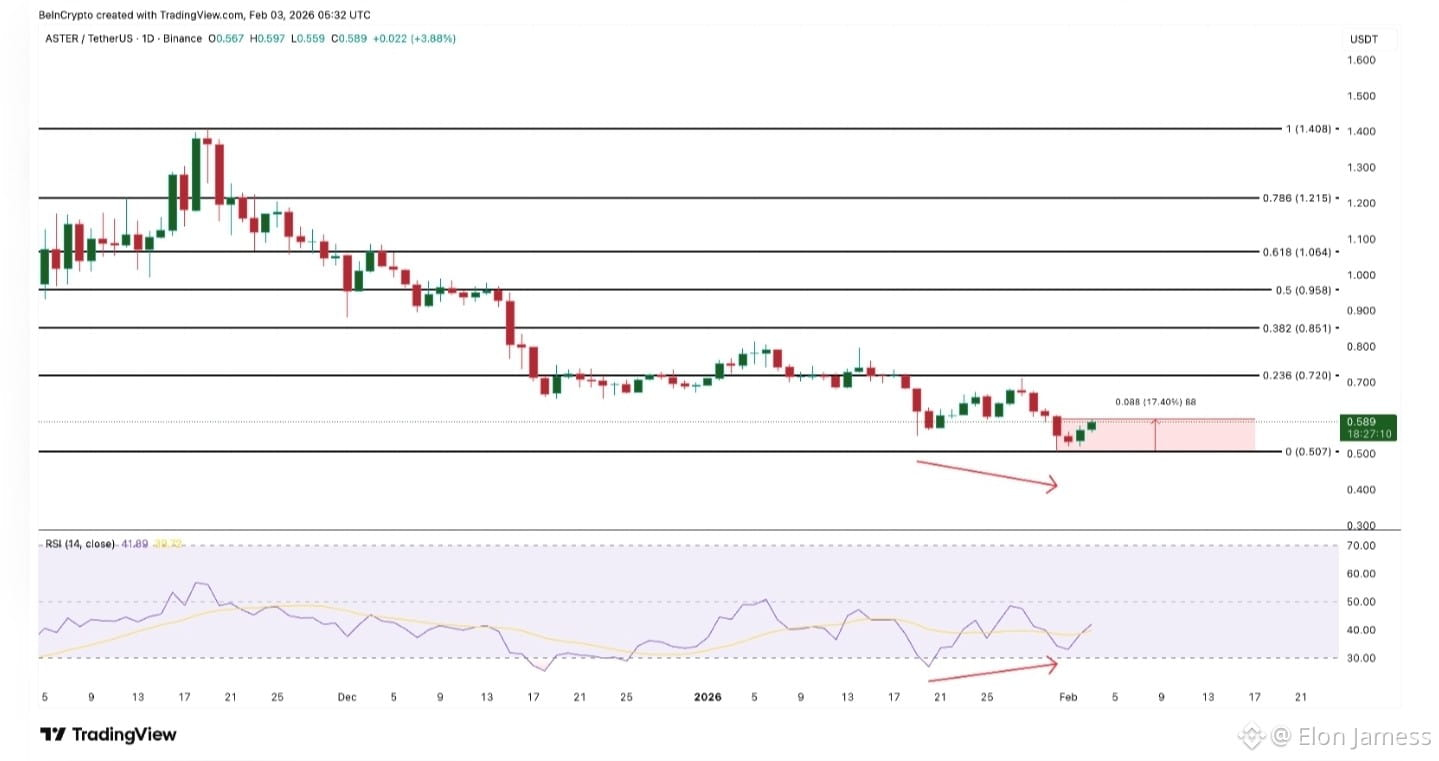Following its late-January lows, $ASTER has bounced almost 18%, tracking the broader market’s stabilization. Notably, a bullish divergence has appeared on the daily chart: from January 19 to 31, the price hit a lower low while the RSI recorded a higher low. Since RSI gauges momentum on a 0–100 scale, this pattern—falling price but rising RSI—often indicates weakening selling pressure and a potential trend reversal.
