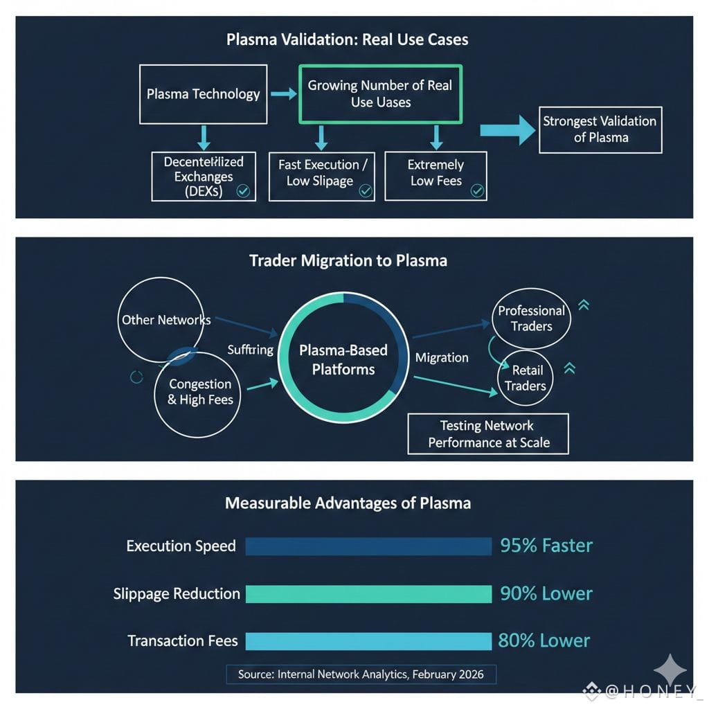 The strongest validation of Plasma comes from the growing number of real use cases. Decentralized exchanges built on Plasma now offer very fast execution, practically no slippage, and extremely low fees. Traders who once suffered from congestion on other networks are now moving toward Plasma based platforms. Professional and retail traders are usually among the first groups to test network performance at scale and their migration toward Plasma is a strong sign that the network is delivering measurable advantages.