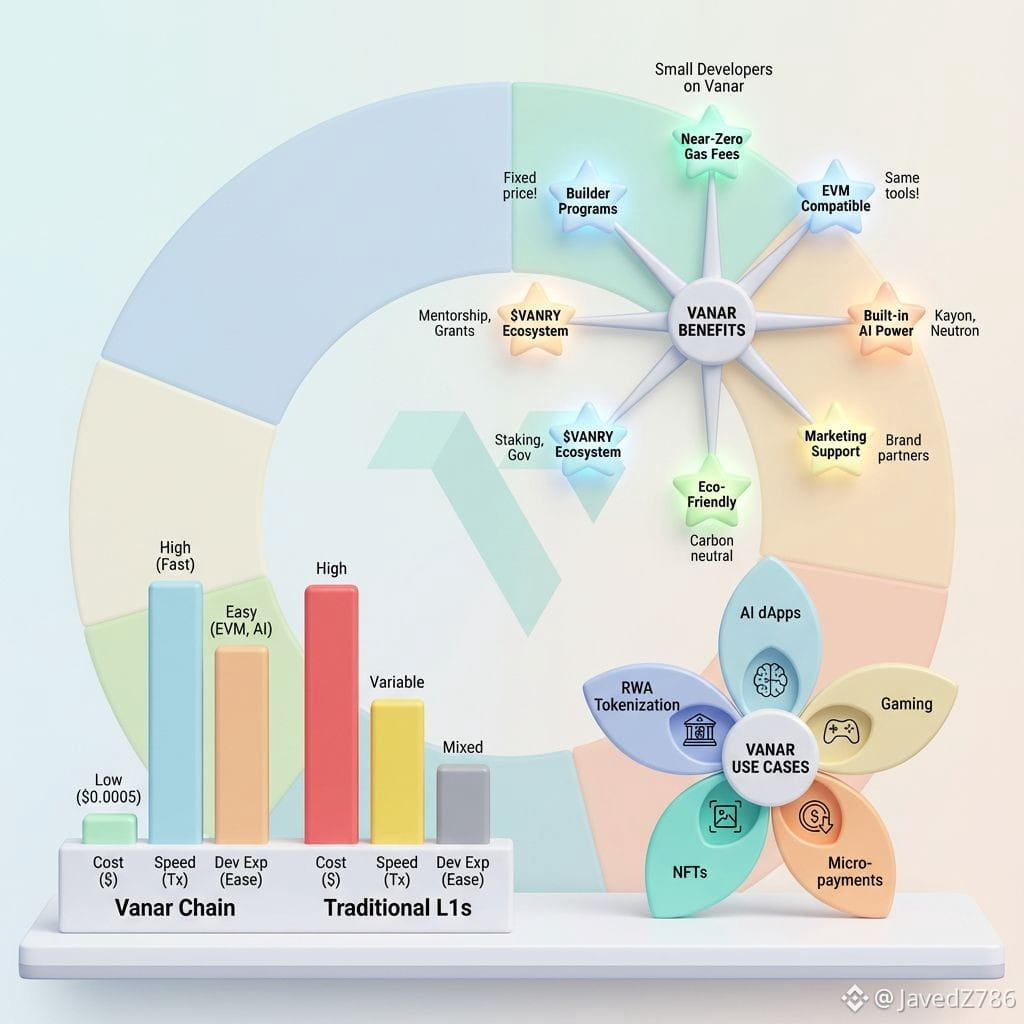Wah! This chain is super cool for small developers like me and my friends who want build dApps, games, or small projects but no big money. Today I tell you why Vanar is best for small devs. Many big chains like Ethereum have high gas fees, slow tx, hard to start. But Vanar change everything! Let's see benefits one by one.First, very low cost yaar! Vanar has near-zero gas fees. Like only $0.0005 per transaction. Fixed price! Imagine you build game or app, users do many tx like buy NFT, play, send tokens – no one angry because fees too high. On other chains small devs pay big gas just for test. Here you save money and users happy. I check on vanarchain.com – they use Google high speed network underwater cable, so super fast also. High speed + low cost = perfect for small projects.Second, easy to build because EVM compatible. Vanar is Layer 1 Ethereum fork. Means you use same tools like Solidity, Remix, Hardhat, Truffle – no need learn new language. If you know Ethereum, you start build on Vanar in minutes, not months. Docs say complete SDKs for JavaScript, Python, Rust. Very good documentation also. For small dev who study alone at home, this is big help. No need big team or college degree.Third, AI power inside chain! Vanar is AI-powered blockchain. They have Kayon, Neutron, Axon coming – for AI agents, smart data, micro payments. Small devs can add AI in their app easily. Like make chat bot, AI game character, or predict stuff onchain. Just few lines code with their intelligent APIs. This is future yaar! Other chains no have this built-in. You can build intelligent dApps fast. Imagine small Indian dev make AI app for farmers or students – possible on Vanar.Fourth, good for user get. Vanar partner with big brands and influencers. Website say "Get your product in front of high-profile brands. Get product exposure through Vanar’s influencers." Small dev no have marketing money, but Vanar help show your dApp to many people. Also they have Kickstart program with partners for tools, discounts, co-marketing, featured placement. Like 20% off on some services. This help small projects grow fast.Fifth, eco friendly and carbon neutral. Vanar care about environment. Many young people like us want green blockchain. Build on Vanar, you feel good that your app not harm planet. High performance but no high energy waste.Sixth, $VANRY token help devs also. $VANRY is main token. Use for gas fees (but still very cheap), staking for secure network, governance vote. If you build good project, maybe community stake and support you. Docs say $VANRY for network security and decisions. Strong token = strong chain = more users for your dApp.Seventh, they have builder programs and support. I see some posts about Vanar Builders Program – mentorship, certificate, infra support, work with team, flexible hours. Also partnership with Movement Labs for world-class product support, technical guidance. Small devs not feel alone. Big chains sometimes ignore small builders, but Vanar focus on help everyone.Eighth, good for games, PayFi, RWA. Vanar build for AI + gaming, micro payments, real world assets. If you small dev want make game with in-game buy, NFT, or tokenize something real – Vanar perfect. Low fees help microtransactions work. No worry about gas kill user fun.I think Vanar is made for people like us – small devs from India, Pakistan, Africa, everywhere who have ideas but no big funding. You start small, test fast, launch cheap, grow with community. No high fees block your dream. Website say "Build future-proof Web3 & AI applications on Vanar, a high-speed, low-cost, and scalable blockchain ecosystem."Bhai, if you small developer, go check vanarchain.com now. Start building! Read docs.vanarchain.com. Join community. Future is here, and small guys like us can win big on @vanar