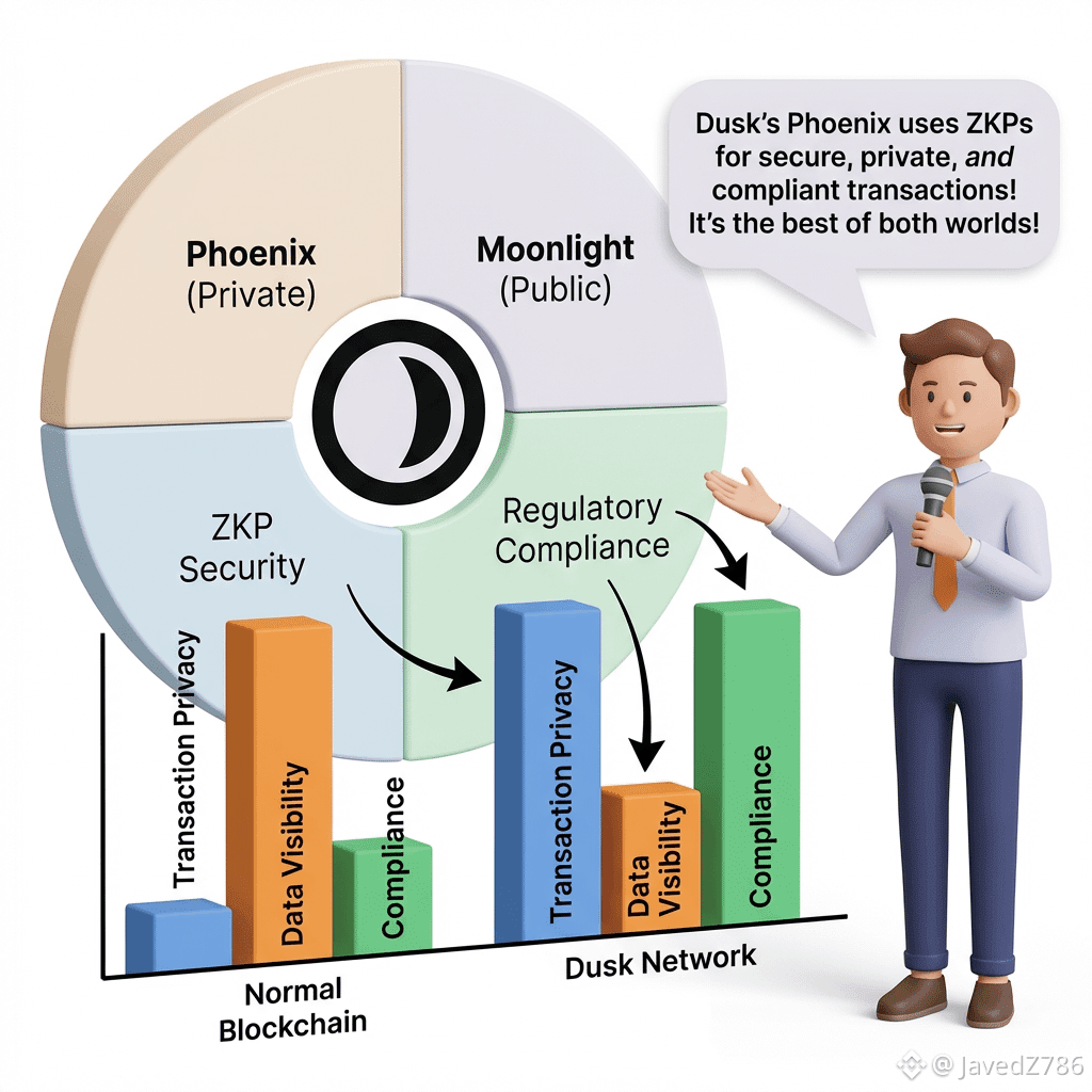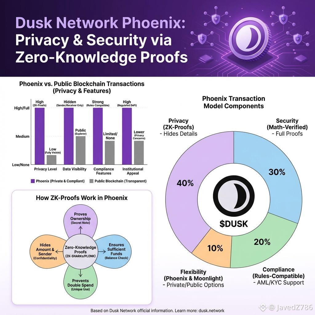 I check their official website dusk.network and docs also, so this info real from there. Let's start! First, what is zero-knowledge proofs? It sound hard but it very easy idea. Imagine you want prove to your friend you know secret password, but you no want tell the password. Zero-knowledge proof let you prove "yes I know it" without showing anything. Nobody learn the secret, but they trust you. In crypto, this magic used to hide money details but still prove everything correct. No one see how much you send, who send, who receive – but blockchain know no cheat happen. Cool right? Now come to Dusk Network. $DUSK is their coin. Dusk not normal blockchain. It build special for real finance and DeFi together. Big companies and normal people both use it. Many blockchains show everything public – like your balance, your sends – everyone see on explorer. This bad because privacy gone, and big banks or government no like join. But Dusk say "we give privacy + follow rules". This why Phoenix so important.Phoenix is special transaction model in Dusk. It like UTXO (unspent transaction output) but super upgraded with zero-knowledge. In simple word: your money live as secret "notes" (like encrypted paper slips). When you send money, Phoenix use zero-knowledge proofs to show:You really own that note