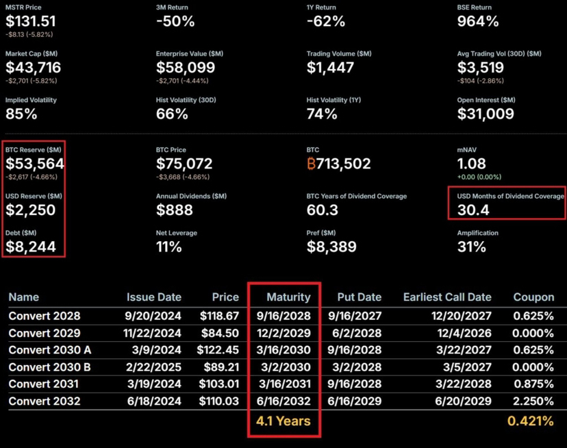 Un alt detaliu trecut cu vederea: Strategia a construit un buffer de numerar semnificativ. Cu aproximativ 2.5 ani de operare rezervată pentru a acoperi obligațiile de dobândă și dividende, compania nu trebuie să acceseze bitcoinul său pentru a îndeplini angajamentele pe termen scurt - chiar dacă BTC petrece timp sub costul mediu de bază.