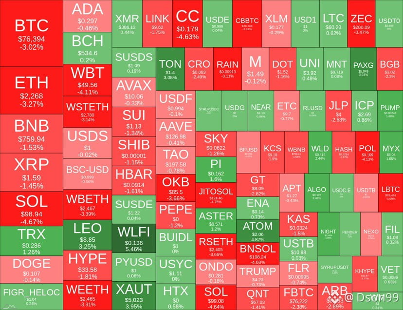 BTC lao dốc xuống $72.900 – mức thấp nhất kể từ tháng 11/2024 (thời điểm Trump đắc cử), rồi bật mạnh hơn 5% lên vùng $76.800 chỉ trong vài giờ!