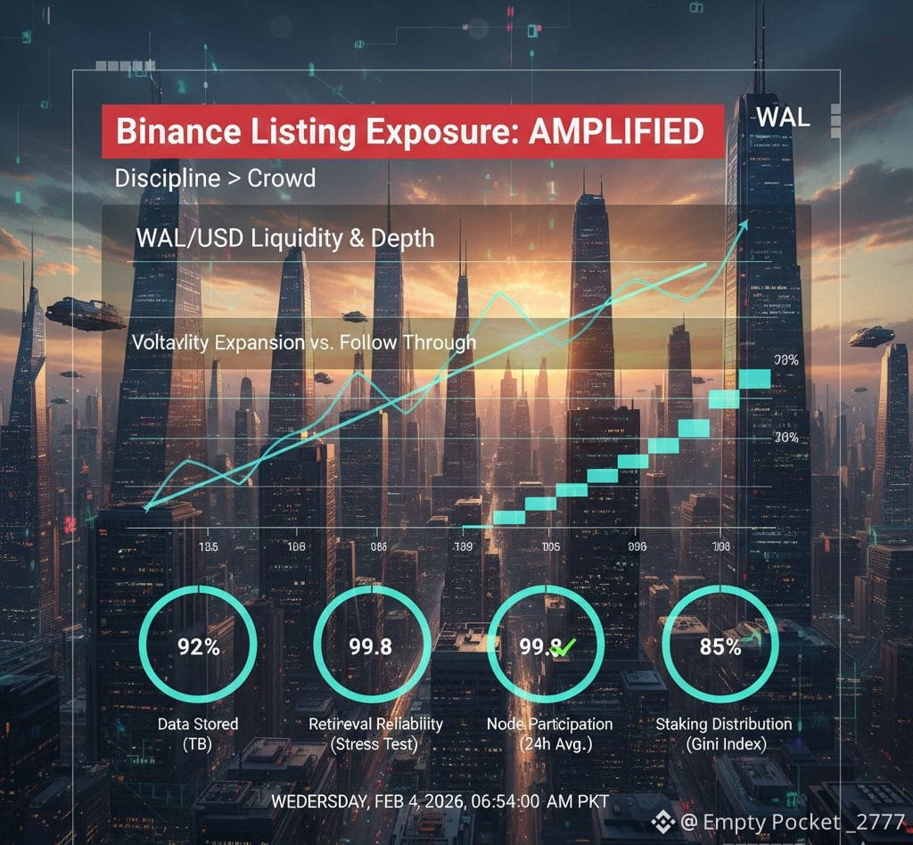 If you want to watch WAL like a pro, the market metrics that matter aren’t mystical, they’re practical, and they connect directly to the protocol’s purpose. I’m looking at liquidity and depth because thin liquidity can manufacture fake breakouts and then punish everyone with sharp reversals, and I’m looking at volatility expansion versus follow through because infrastructure assets often trend best when dips get bought methodically instead of emotionally. I’m also watching signs of real adoption, not in the vague “community growth” sense, but in the sense of whether more data is being stored, whether retrieval reliability holds during stress, whether node participation remains healthy across time, and whether staking becomes broadly distributed instead of concentrated. Binance listing exposure can amplify all of this, because it makes access easier and accelerates the feedback loop between narrative, liquidity, and price discovery, but that same acceleration can also intensify overreactions, so discipline matters even more when the crowd is loud.