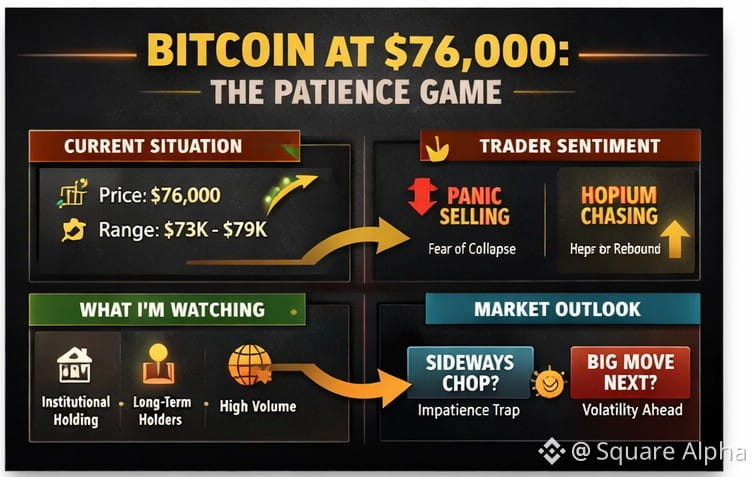 At $76,000, Bitcoin is not behaving like an asset being abandoned. Liquidity hasn’t dried up. Volume hasn’t collapsed. This is not what distribution looks like. This looks like position cleanup — leverage being punished, weak conviction being flushed, and price being forced into a zone where patience matters more than predictions.