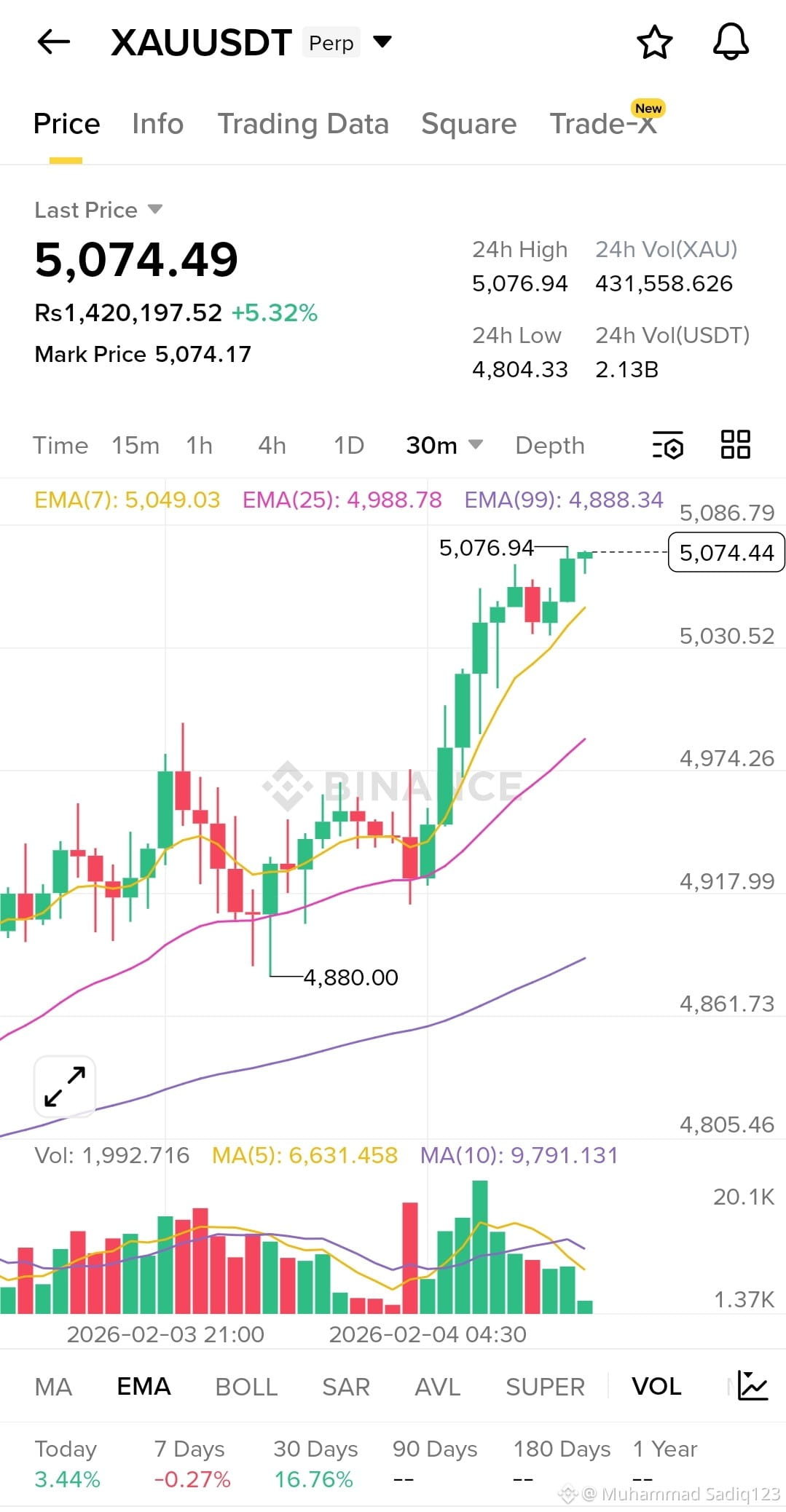 XAUUSDT is currently showing strong bullish momentum on the 30-minute and higher timeframes, supported by a clear breakout above the key resistance zone near 5,000. Price is trading above EMA(7), EMA(25), and EMA(99), which confirms a healthy uptrend structure and strong buyer control. The recent impulsive candle from 4,880 to 5,076 reflects institutional participation and stop-hunt liquidity sweep followed by continuation. Volume expansion during bullish candles further validates this move. As long as price holds above the support range of 5,000–4,980, the trend remains bullish. A successful consolidation above this zone can trigger another expansion phase toward 5,120 and 5,180. RSI and momentum indicators suggest strength without extreme exhaustion, meaning continuation is technically favored rather than reversal. Overall structure is higher highs and higher lows, indicating trend-following buyers are dominant and dips are likely to be bought aggressively. From a fundamental and Forex Factory perspective, Gold is gaining strength due to rising uncertainty in macroeconomic data, weakening USD sentiment, and expectations of potential interest-rate adjustments. Any soft US economic data or dovish Federal Reserve tone continues to support Gold as a safe-haven asset. Market sentiment remains bullish as geopolitical risks and inflation concerns keep demand elevated. If bullish momentum sustains, XAUUSDT can target the next resistance levels at 5,120, 5,180, and potentially 5,250 in the short term. However, failure to hold above 4,980 may trigger a corrective pullback toward 4,940–4,900. before continuation. Traders should watch high-impact Forex Factory news such as USD CPI, NFP, and FOMC statements, as volatility will expand significantly around those events. Overall bias remains bullish unless price breaks below the major structure support at 4,880. Trend, volume, and fundamentals are aligned in favor of buyers, making XAUUSDT one of the strongest instruments to watch in the current market environment.
