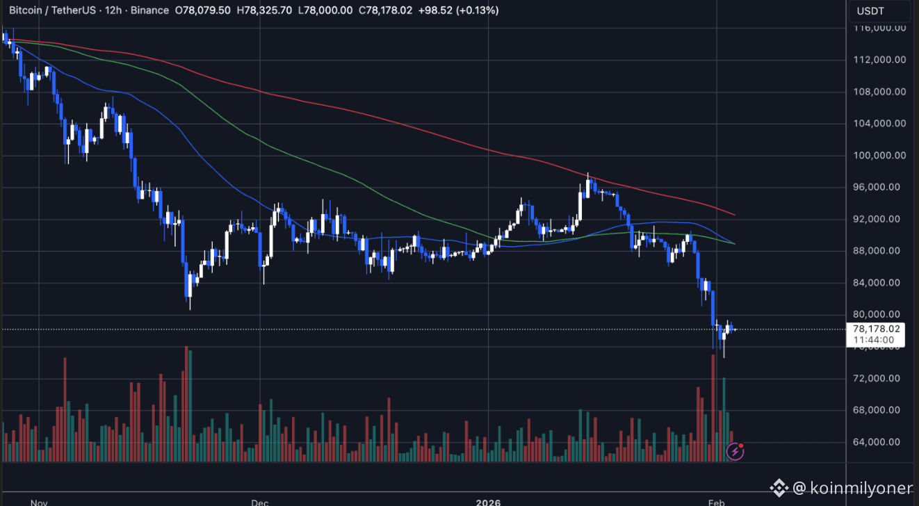 After dumping from the mid-$90Ks, Bitcoin sliced through multiple moving averages with heavy volume, signaling liquidation-driven selling rather than orderly profit-taking. Since bottoming near $78K, price has attempted to stabilize — but the rebound is weak.